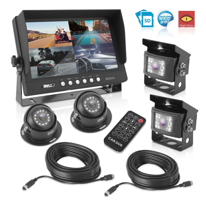 Vehicle Back-Up Camera & Monitor DVR Kit with 9 Display, Video Recording, Quad-View, Night Vision, Waterproof Cams (For Truck/Van/Bus/Trailer)